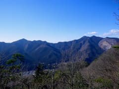 尾根末端には石碑や石祠があるそうだが、南に結構下ることになるので割愛して、北に向かう。ところどころに岩場がある細い尾根で、小さなアップダウンが続く。両側とも山麓が近く、車の走行音が聞こえる。冬枯れの樹林に覆われて、展望は木の間越しに限られる。左手には秋山川を隔てて、先月歩いた石尊山と浅間山の鋭鋒が並んで眺められる。