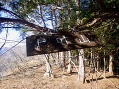 峠から戸叶山への登りにかかる。小さな岩場を越えると一直線の急登となる。露岩が現れると傾斜が緩んで、戸叶山の広く平坦な頂上に着く。比較的新しい山名標が木の枝からぶら下がり、その下には古い石標がある。頂上の西面は石灰採掘によって削り取られ、大岩壁を形成している。腹ペコなので、まずは昼食。山専ボトルに入れてきたホットココアを飲み、パンを齧る。