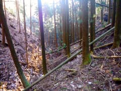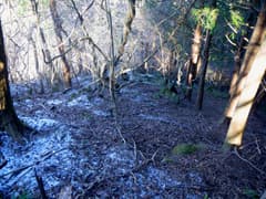 塩沢峠に下り着き、これは良く覚えている首なし地蔵尊と再会する。ここから西に下る。地形図には谷沿いに破線路が記載されているが、下り始めると道型はすぐに消失し、ザレた急斜面が谷底に向かって広がる。ここを真っ直ぐに下り、杉林に入って水のない谷を下る。傾斜が緩むと水流の脇に踏み跡が現れ、倒木が多くて跨いだり潜ったりが煩わしいが、かなり歩き易くなる。
