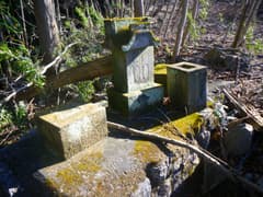 展望を楽しんだのち、尾根を北へ下る。鉱山の廃れた作業道が尾根まで達し、岩屑が散乱して荒れ気味だ。途中、石の台座の上に3基の石祠がある。「明治十年四月 水木村氏子中」の銘があり、そこそこ古い。台座は比較的新しいので、鉱山の開発に伴って他から移されたものなのかも。採掘が終わった現在では、石祠の周囲も荒れるに任されている。