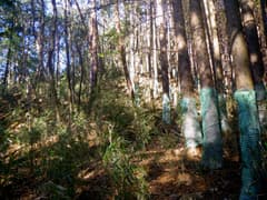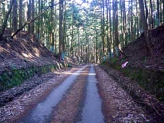 尾根の途中に3本のモミ?の大木があり、そこから右に下って、仙波川上流から秋山川へ抜ける大釜林道に下り着く。西に寄り過ぎたので、林道を東に少し辿り、「←五丈の滝5.3K 高齢者センター6.3K →」の道標が建つY字路(栃久保林道起点)から520m三角点峰に向かって斜面を登り始める。