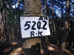 なおも樹林に覆われた尾根を降りると、下からチリーン、チリーンと鈴の音が近づいてくる。こんなマイナーな山を訪れるハイカーさんがいるとは。もしかしてその筋の人かもと思ったら、橙色のジャケットが目に入る。ハンターだ。幸い、私には気づかなかったのか、尾根から外れて山腹をトラバースして去って行き、事なきを得る。