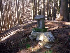 再び杉林に入り、小さな鞍部に下ると2基の石祠がある。一つは風化した祠。もう一つは比較的新しいもので、苔むした台座には「上仙波 大○ 氏子中」の銘がある。大○は多分、東麓の大釜集落のことだろう。ここも峠越えの道型が残る。