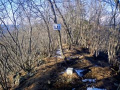 この斜面は杉林に覆われ、篠竹がポソポソと生えている。作業道の道型が斜面を深く掘り込んでジグザグに登っているが、道型の中は篠竹藪が濃いので、直登した方が手っ取り早い。登り着いた頂上は杉林に囲まれ、三角点(点名:岩沢、俗称:高山)の標石とR.K氏の標高プレートがある。展望に乏しく、パッとしない頂なので、サクッと先に進もう。