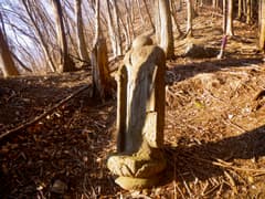 小ピークから急坂を下る。薄く雪が積もって滑り易い。雪の上には登山靴の足跡があり、先行者がいるようだ。不動岳との鞍部から登りにかかる地点に石祠がある。「文化六己(1809)二月 願主 ○○内 政七」の銘がある。ここはかなり奥まった場所になるが、かつては峠道が通じていたのだろうか。