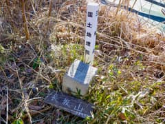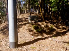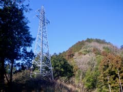 短い急坂を上ると左に眺めが開け、新しいベンチが設置されて、道端に228m三角点(点名:片山)の標石がある。この先の尾根もよく整備された遊歩道がしばらく続く。行く手に送電鉄塔を見ると、左に下る遊歩道と別れて、尾根上の細い山道に入る。