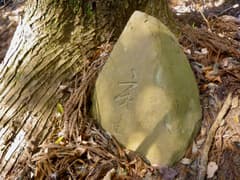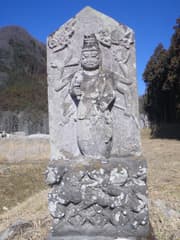 タカバタ山を経由して佐野・栃木市境尾根に出るつもりだったので、代替案として、立入禁止区域を通らず直接に市境尾根に上がることにする。車道を戻ってすぐ、民家の脇に山道の入口を発見して、入ってみる。入口には、芝に囲まれた石灰岩の上に、タカバタ山を背にして一体の青面金剛像が建つ。一面六臂で左手にショケラを下げ、台座に彫り込まれた天邪鬼を踏みつけ、その下に三猿がいる。これは立派な尊像である。タカバタ山に登れなくてがっかりしていたが、良い物が見られて、何が幸いするかわからない。