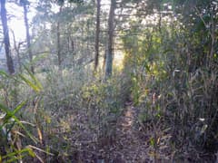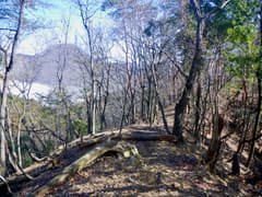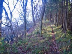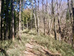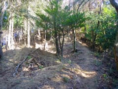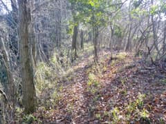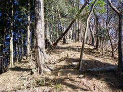 良い山道はユルユルと上下する尾根上にずっと続き、ポサポサと篠竹藪のある区間にもはっきりとした道型がある。しかし、展望も変化も乏しい尾根で、こんな所を歩く人はいないよなー、などと若干マイナーな気分で歩いていると、なんと2人組の男性ハイカーさんにぱったり行き会う。こんな超地味尾根で山歩きの人に会うと予期していなかったのはお互い様のようで、双方びっくりして挨拶を交わす。ずっと南から尾根を辿り、この先の切り通しまで行って引き返して来たそうだ。これはその筋の方々に違いないな(後日、ブログに記事がアップされて、みつまんさんのご一行であることがわかる)。