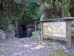 展望台から二手に遊歩道が分かれ、どちらを下ってもすぐに宇津野洞窟に着く。洞窟前の広場には東屋や水飲み場がある。洞窟はごく小規模のもので、すぐに奥に突き当たるが、それなりに鍾乳洞。狭くて天井が低いので、頭をぶつけないように注意(ぶつけた^^;)。
