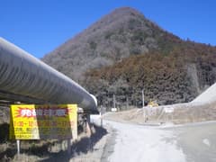 大型ダンプが往来し、白い粉塵を被った車道を歩いてタカバタ山に向かう。山麓の少し手前に「この先、鉱山内への立入を禁止します。※立入は鉱業所事務所の許可を得て、係員の指示に従って下さい。」と書いた看板がある。やっぱりダメかー。すぐ手前にある事務所にも立ち寄ってみるが、やはり施錠されていた。今日の登頂は残念ながら断念する。