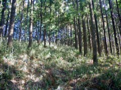 杉林に入ると多少歩き易くなり、やがて作業道と合流するが、今度は篠竹藪に突入。尾根は左に曲がり、作業道の跡に出る。この辺りは住友大阪セメントの工場の裏山にあたり、木の間を透かして工場を間近に見おろす。
