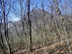 すぐ先には3基の新しい石祠もあり、側を通って杉林に入る。山道はやがて途絶えて、篠竹が繁る尾根の登りとなる。冬枯れの雑木林となり、左手に木立を透かしてタカバタ山を見ながら登ると市境尾根の上に出る。市境尾根上には意外と良い山道が通じている。会沢峠、長坂山方面は右(南東)だが、せっかくの機会なので左(北)に市境尾根を辿り、地形図に峠道が記載されている地点辺りまで往復してみよう。