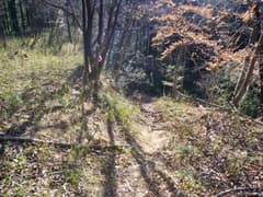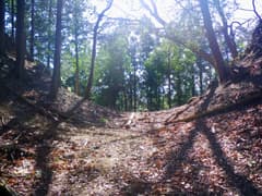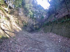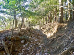 金網フェンスの間を抜けて、市境尾根を進むと送電鉄塔が建つ小平地(352m標高点)に出る。市境尾根上にはさらに山道が続いているが、今日はここから西へ枝尾根を下る。深く抉れた掘割道がずっと通じて、往時は繁く往来があったことを示す。しかし、掘割の中は落ち葉や倒木で埋まり、完全に廃道化して歩き難い。掘割道の脇を進むが、低木藪の小枝が煩わしい。今日、一番でほとんど唯一の藪漕ぎとなる。
