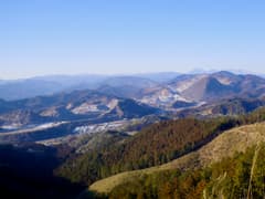 ここで引き返して、市境尾根を南下する。良い山道が続く尾根を辿ると、突然行く手が開けて、大規模な砕石場の掘削された崖の上に出る。市境尾根から東に外れて、327m標高点に来てしまった。これは大失敗だが、これから向かう会沢峠から390m標高点(大きな電波塔が建つ)、長坂山にかけての稜線を眺めることができたから、ま、いいか。