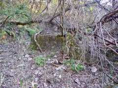 杉林の中を下ると、篠竹藪の中にブロック造の小屋がある。こりゃなんだと思って周囲を見回すと、倒木が覆い被さった石垣の台座を発見。これが山神社の跡地だろうか。嘉多山公園に遷宮したのが31年前だから、こんなに荒廃するのももっともなことではある。