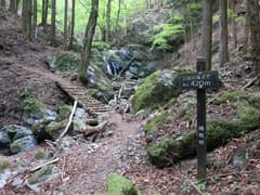 大展望を堪能したのち、下山にかかる。岩稜を慎重に下れば、あとは安心して歩ける一般登山道だ。碧岩沢沿いの山道を下り、碧岩入口で往路に合流。居合沢沿いの遊歩道を下る。途中で単独のハイカーさんとすれ違ったが、三段の滝を鑑賞しに行くのだろう。
