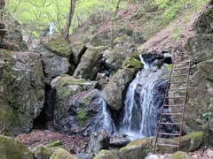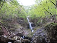 木橋や鉄橋で何度も沢を渡り返す。鉄梯子で小滝を越えると三段の滝が現れる。落差約50mと言われ、綺麗に三段に分かれて滑るように落ちる美瀑だ。