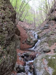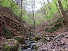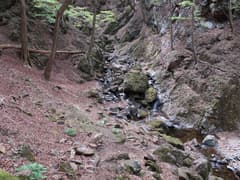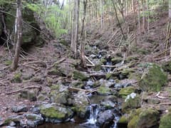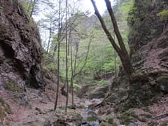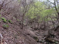 最初は岩がゴロゴロ堆積した峡谷の底を遡るが、すぐに両岸とも新緑や杉林に覆われた緩やかな斜面となり、水流に沿って断続的に踏み跡が現れる。平凡な沢だが、のんびり歩けるのはいい。川岸にはハシリドコロが多い。沢を何度も右へ左へと渡るが、登山靴を濡らすような箇所はない。