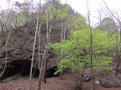 やがて両岸の傾斜が強まって谷が狭まり、小さなゴルジュの中に小滝がある。ごく小さい滝だが、沢に変化が出てきた。これは簡単に通過。この辺りは二子岩西峰から西に落ちる岩稜の末端に位置し、左を見上げると小岩峰とその奥に大岩峰が聳えている。小岩峰の基部には大きな岩窟があり、なかなかの奇観だ。