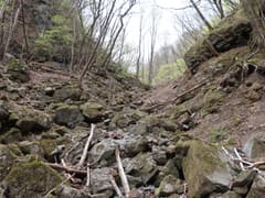 岩峰を見上げつつ遡行すると傾斜のあるゴーロとなり、水流は伏流となって消える。岩峰から崩れた落ちた岩が堆積したものと思われ、あまり長居はしたくない区間だ。