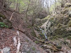 ゴーロを越えると水流が復活し、ハシリドコロやネコノメソウが群生して咲く。水流は徐々に減じて、沢の傾斜も増す。小滝が現れ、その上でククリ岩の西面の水を集めた小沢が左から出合う。地図とGPSで現在地と地形を確認して、この二股を左に入る。