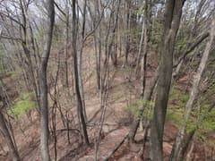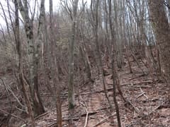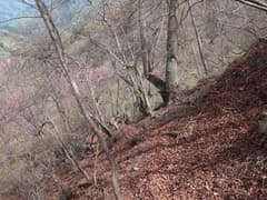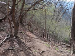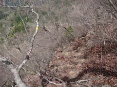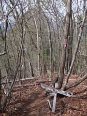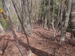 少し東峰に戻って登るとテープが巻かれた木立があり、そこから明瞭な踏み跡が急斜面を下っている。これは恐ろしく急だが歩き良い山道で、小尾根を下ったり斜面をトラバースしたりを繰り返しながら、ぐんぐん下る。要所にテープがあり、進路は分かり易い。