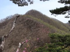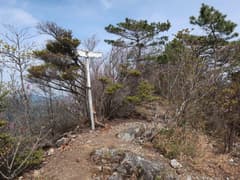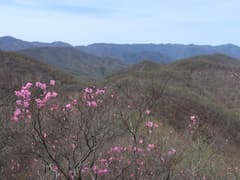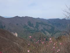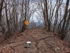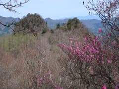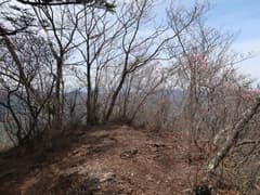 頂上には三角点標石と黄色い看板があるだけで、看板に付けられたGさん山名標の他に山名を示すものはない。かつては頂上も篠竹に囲まれていたようだが、今は笹藪もなくて、小広くスッキリしている。雑木林に囲まれて展望は乏しいが、頂上から少し南に向かうとアカヤシオの群落があり、また南側は急斜面となって切れ落ちているので、アカヤシオの梢越しに展望が得られる。アカヤシオの咲き具合は五分咲きといったところだ。