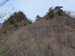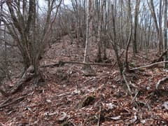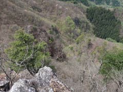 稜線を急登するとアカヤシオも尽き、冬枯れの雑木とカラマツに覆われた小ピークを越えて、ククリ岩への最後の登りにかかる。残置ワイヤーがあり、かつては植林が行われていたのだろう。かなり急な坂だが、落ち葉に覆われた地面は適度に柔らかく、足を置きやすい。急坂を登りきり、緩やかな稜線をひと登りしてククリ岩の頂上に着く。