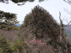 まずはククリ岩に向かう。急な稜線を登ると、左斜面にアカヤシオが群れて咲いている。今回、アカヤシオは特に期待していなかったので、これはサプライズで嬉しい。振り返るとアカヤシオ越しに二子岩が見え、良い眺めである。