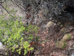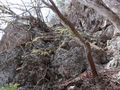 さて、次の核心部は、二子岩北面の下りである。西峰と東峰の鞍部から北面を覗き込むと、樹木は生えているものの、ほとんど崖と言って良い急斜面である。ネットの情報ではルートがあるはずだが、下り口はどこだろう。