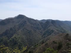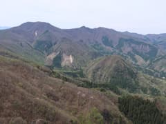 まず、南を眺めると、カラマツ林に覆われた緩やかな上信国境稜線が低く横たわる。奥の平坦なスカイラインは四方原山辺りだろうか。目を西に転じると、大上峠から余地峠にかけて上信国境稜線がググッと盛り上がり、いくつかの顕著なピークを起こす。中腹のずいぶん高い所に見える集落は、南牧村自然公園キャンプ場のようだ。稜線の向こうに目を凝らすと、彼方に北アの白い峰々が見える。
