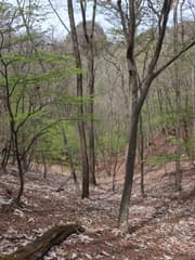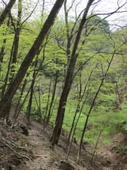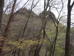ようやく傾斜が緩み、新緑の雑木林に覆われた尾根に下り着く。振り返れば木の間に二子岩を仰ぐ。ここまで来れば一安心。あとは緩やかに上下する尾根をのんびり辿る。