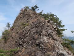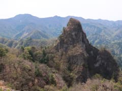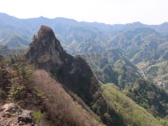 腹を満たして英気を養ったのち、本日の核心部の二子山西峰に向かう。見上げる西峰は、先日登った大津の北西峰以上に鋭く切り立って、これ登れるの?という感じ。岩峰基部を左に回り込むとマーキングがあり、急傾斜のバンドを登る。ここはホールド、スタンスともしっかりあって問題ない。そこから右上に、岩壁に生えた立木を頼りに直上する。最後はホールドがない急斜面となるが、先達が残してくれたテープスリングを摑んで登る。岩稜に出れば傾斜も緩んで、西峰の頂上に登り着く。