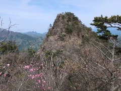 ククリ岩の頂上で、のんびり30分程も展望とアカヤシオを楽しんだ。そろそろ二子岩に向かい、東峰の頂上で昼食にしよう。登ってきた稜線を戻り、二子岩との鞍部に下る。鞍部の手前は痩せて急な岩稜となり、岩稜伝いでも下れなくはないが、左に巻き道がある。岩稜から二子岩の二つの岩峰を仰ぎ、碧岩と大岩が謂わば裏側から眺められる。