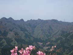 登り着いた大岩の頂上には、誰もいない。ここのアカヤシオは既に終盤だ。東を除く三方の眺めが開け、北にククリ岩と、黒々とした岩峰が並ぶ二子岩が眺められる。よく見ると、ククリ岩の中腹にも小さな岩峰がひと続きとなって二子岩に連なる。地質的に固い層があるのかな。興味深い。