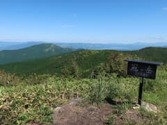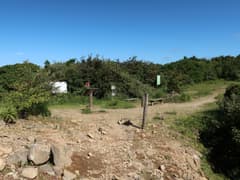 最後に軽く登って、草原が広がる冠ヶ岳の頂上に着く。ここも草叢の中に三角点標石がある。頂上から先は北西に下る道があり、山麓を回って地蔵峠に戻る「一周コース」の道標がある。360度の展望が開け、ベンチもあって憩うのにもってこいの頂だ。