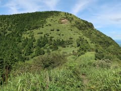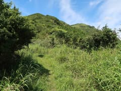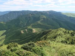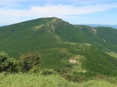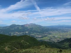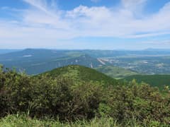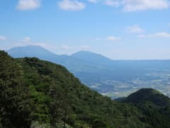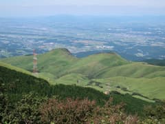 西側には緑鮮やかな草原の緩斜面が広がり、いかにも阿蘇という感じ。一ノ峯、二ノ峯の形の良い双子の丘が目を惹く。その向こうには熊本市街を望み、金峰山と雲仙岳の山影を遠望する。大展望を写真に収めたのち、分岐に戻って、再び外輪山の縦走路を北に辿る。