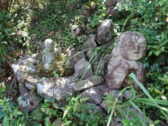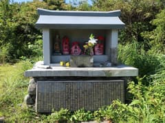 出先の山歩きの軽装(トレランシューズ+布製ザック)で出発。すぐ上が稜線で、擬木の階段を上がって樹林帯の山道を登ると、ザレ地となって開けた地蔵峠に着く。ここも高岳や根子岳の眺めが良い。峠の一角にはコンクリブロック製の御堂があり、中に4体の地蔵尊が祀られている。昭和20年代に九州電力の社員と子供1人が天候急変でこの峠で遭難し、その慰霊のために昔からあった地蔵尊に1体を加えて、御堂を建立したそうである。