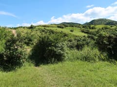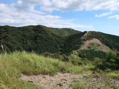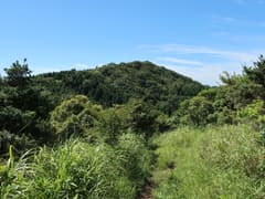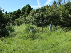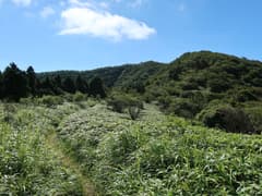 護王峠は草深く、峠越えの道は歩かれていないようだ。ここから俵山の頂稜が高く見上げられる。標高差は約200mあり、長距離を歩いてきたあとではなかなかしょっぱい。まあ、ゆっくり行くとしよう。数体の風化した石仏を過ぎ、中低木帯と草原に覆われ、ところどころザレのある稜線を急登する。小ピークに登り着いて一息入れ、最後に草原の急斜面を上がって、頂稜の一角に登り着く。右に俵山峠への道を分け、左に平坦な稜線を辿って、俵山の頂上に到着する。