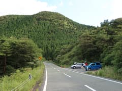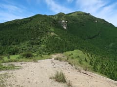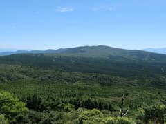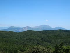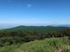 俵山から歩いて来た稜線を振り返れば、冠ヶ岳と大矢岳が遥か遠くに見える。少し休憩したのち、往路を地蔵峠へ戻る。護王峠への大下りは快適にこなすが、峠から冠ヶ岳分岐へのアップダウンは応える。山行のブランクと暑さのためか、結構疲れてペースダウン。しかし、冠ヶ岳分岐まで来れば、あとは平坦で楽な道だ。グリーンロード南阿蘇に出て、そのまま車道を辿り、地蔵峠登山口の駐車場に帰着する。最後のハイカーさんグループが帰り支度をしているところで、他の車は既に帰ったあとだ。