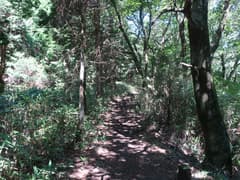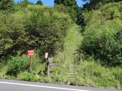 大矢岳から地蔵峠に戻り、そのまま外輪山を辿って、グリーンロード南阿蘇を横断。擬木の階段を上がって再び縦走路に入ると、ヒノキ林とスズタケに覆われた広くなだらかな高原状の稜線が延々と続く。右側は樹林に覆われたカルデラ壁の急斜面となり、一方、左側はヒノキ植林帯の緩斜面となっている。展望が全く得られない地味〜な区間だが、ほとんど平坦なので距離はぐんぐん稼げる。