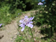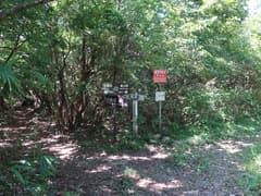 小ピークを下って、樹林とスズタケに覆われたピークに登り返すと、一ノ峯への山道を左に分ける。そろそろ正午に近く、腹が減ったので休憩したいのだが、なかなか適地がない。ヒノキ林の斜面を急降下し、小ピークを一つ越え、登り返すと見晴らしの良いピークに着く。道標にマジックで「中間ピーク」の書き込みがある。行く手の縦走路はここから護王峠に大きく下り、俵山へ大きく登り返しており、なかなか骨が折れそうだ。ここで一休みして、パンとペットボトルのお茶で昼食とする。じっとしていれば爽やかなそよ風が吹いて涼めるが、日差しが強くて前腕と首筋の肌がチリチリ日焼けする感覚がある。