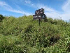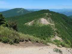 峠からは、最初に外輪山を南東に辿って、大矢岳に向かう。草原と中低木帯の緩やかな稜線を登り、程なく大矢岳の頂上に到着。草叢の中に三角点標石がある。頂上の周囲の樹林は切り払いされて、360度の展望が得られる。東には外輪山の稜線がゆったりとうねって連なる。あちらへは大矢野岳(1236m)、駒返峠を経て、高森峠まで縦走路が続いているとのことである。