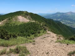 小ピークからザレの左脇の草原を急降下し、最後はトラロープを伝って緩やかな稜線に降り立つ。ザレた稜線を緩く登り返して、次の小ピークに立つ。ザレ場の頂から南郷谷を隔てて阿蘇五岳がどっしりと眺められる。