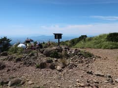 頂上周辺は草原が広がり、数組のハイカーさんが休憩している。この頂も360度の展望が得られる。立野火口瀬(外輪山の切れ目)を隔てて北外輪山が近く、2016年4月の熊本地震で阿蘇大橋を崩落させた大きな地滑りの跡もはっきり見える。俵山は、冠ヶ岳より少し標高は低いが独立した山容の山で、九州百名山の一座に選ばれている。