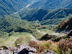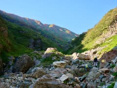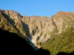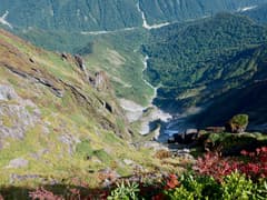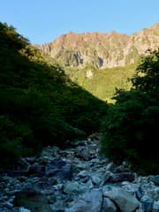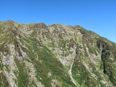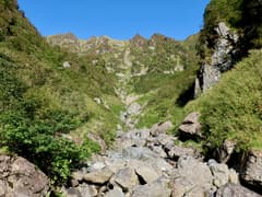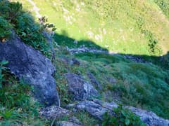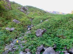 沢を飛び石伝いに右岸に渡り、草付きの急斜面を一直線に登る。非常に急ではあるが、良く刈り払いされ、岩場にはロープや鎖が設置されている。武能岳の稜線から切れ落ちたスラブを背にして、グングン高度を上げる。振り返って見下ろせば、沢の中をもう1組のハイカーさんが遡っているのが見える。なかなか人気のコースだ。