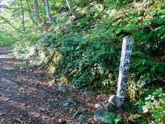 一ノ倉沢を横切ると舗装が終わって砂利道となる。道の左脇の岩壁には、一ノ倉沢で遭難したクライマーの夥しい数の慰霊プレートがあり、見ると桐生の山岳会のものもある。