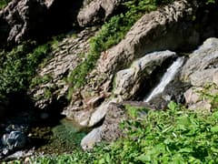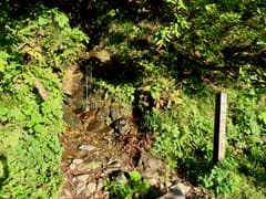 一ノ倉尾根の鼻で新道との連絡路を分けると、その先に旧清水越国道の石積が残っている。やがて頭上にのし掛かるように幽ノ沢の岩壁が見えてくる。大石が堆積した幽ノ沢を渡ると、道の脇に「ブナのしずく」と呼ばれる水場があり、湧き水が滴り落ちている。