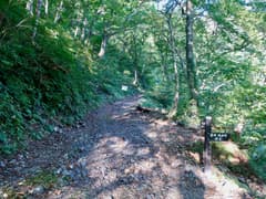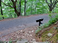 やがて新道への連絡路が左に分岐する地点に着く。旧道にはトラロープが張り渡され、新しい案内プレートが掛かっている。曰く「注意!この先、芝倉沢までは林道が続きますが芝倉沢から先の旧道(登山道)は武能沢付近の崩壊が激しく滑落、落石の危険度が高いため新道の利用をお勧めします。残雪期や雨天時などは更に危険を伴います。」とある。この情報は、事前にネットで得ていた。
