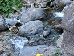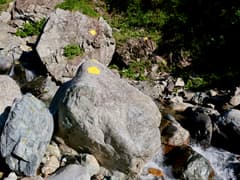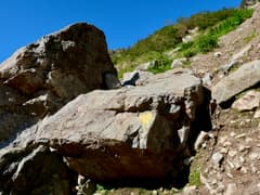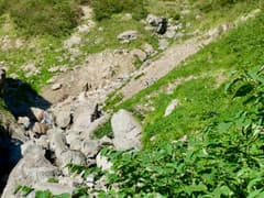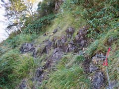 まず右岸を登る。刈り払いされて歩き易い。黄色いマーキングに従って左岸に渡り、踏み跡を辿って滝を横目に登る。なおもロープを伝い、草付きの高いところをトラバース。先行するハイカーさんが崩壊地に突き当たり、下れる個所を探してちょっと迷って居られる。手前にマーキングとテープが見えるから、あそこを下ればいいんじゃないかな。